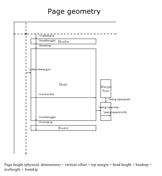 The figure 3.2 (above) illustrates the top level geometry of a page. The default margins on a page are defined as: