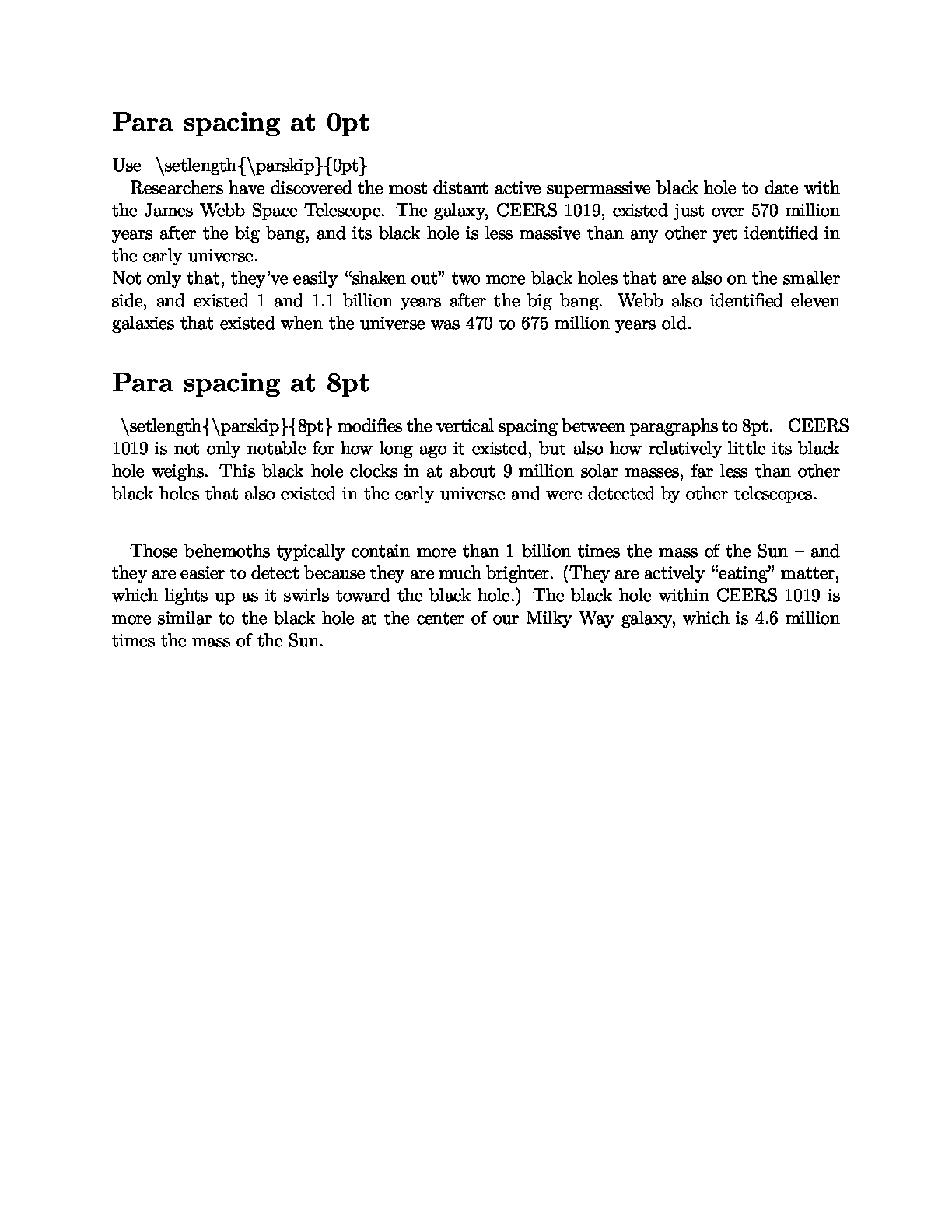 1. \documentclass[12pt]{article} 2. \usepackage[margin=1in]{geometry} 3. \usepackage{listings, parskip} 4. \setlength{\parindent}{1em} 5. \pagestyle{empty} 6. \begin{document} 7. \section*{Para spacing at 0pt} 8. Use \lstinline + \setlength{\parskip}{0pt}+ 9. \setlength{\parskip}{0pt} 10. Researchers have discovered the most distant active supermassive black hole to date with the James Webb Space Telescope. The galaxy, CEERS 1019, existed just over 570 million years after the big bang, and its black hole is less massive than any other yet identified in the early universe. \\ 11. Not only that, they’ve easily ``shaken out'' two more black holes that are also on the smaller side, and existed 1 and 1.1 billion years after the big bang. Webb also identified eleven galaxies that existed when the universe was 470 to 675 million years old. 12. \section*{Para spacing at 8pt} 13. \lstinline + \setlength{\parskip}{8pt}+ modifies the vertical spacing between paragraphs to 8pt. 14. \setlength{\parskip}{8pt} 15. CEERS 1019 is not only notable for how long ago it existed, but also how relatively little its black hole weighs. This black hole clocks in at about 9 million solar masses, far less than other black holes that also existed in the early universe and were detected by other telescopes. \\ 16. Those behemoths typically contain more than 1 billion times the mass of the Sun – and they are easier to detect because they are much brighter. (They are actively “eating” matter, which lights up as it swirls toward the black hole.) The black hole within CEERS 1019 is more similar to the black hole at the center of our Milky Way galaxy, which is 4.6 million times the mass of the Sun. 17. \end{document} |